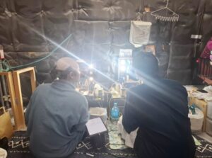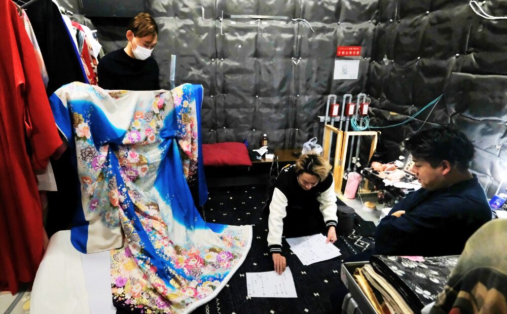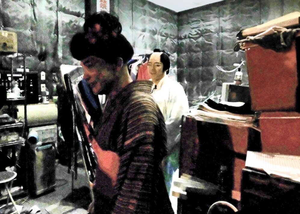 終演後、片づけをする泰河座長と寝転がっている千代丸座長。