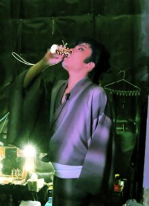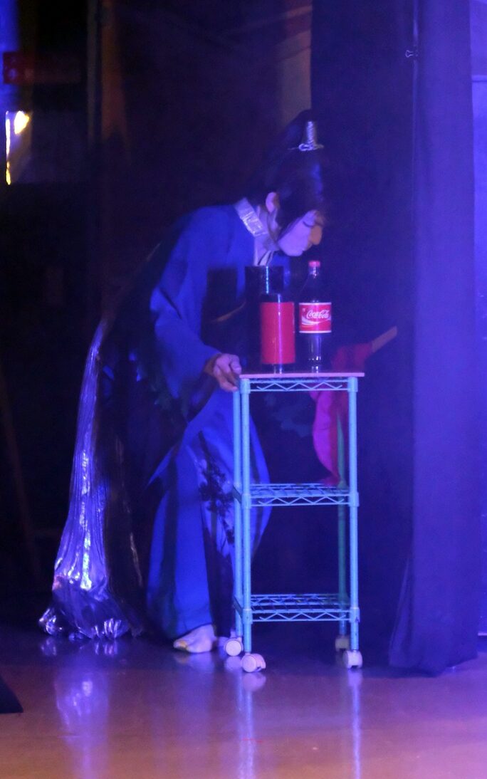コーヒーを飲みに舞台袖に捌けた千代丸座長。