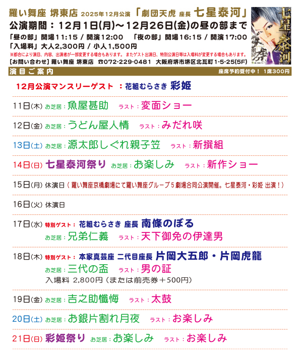 ※ゲスト出演日、特別公演日等は入場料が変更する場合もあります。