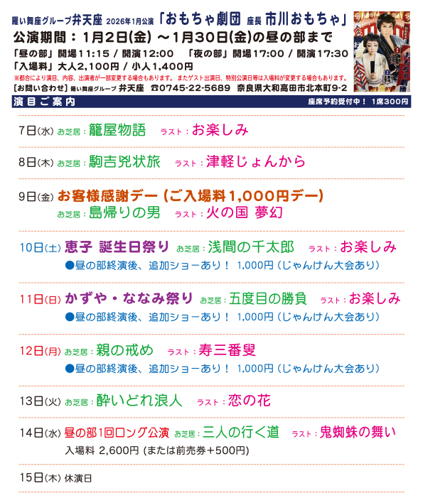 | 2026年1月 | 優伎座 座長 市川英儒 座長 市川侃汐朗 | 劇団雪月花 座長 桜川翔 | 劇団天虎 座長 七星泰河 | おもちゃ劇団 座長 市川おもちゃ | 宝海劇団 座長 宝海大空 |