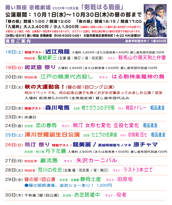 2025年10月 | 剣戟はる駒座 座長 津川鵣汀 座長 津川祀武憙 | 澤村慎太郎劇団 座長 澤村慎太郎 | 劇団雪月花 座長 桜川翔 | 劇団十六夜 座長 市川叶太郎 若座長 七代目 市川千太郎 | 劇団神龍 座長 澤村神龍 |