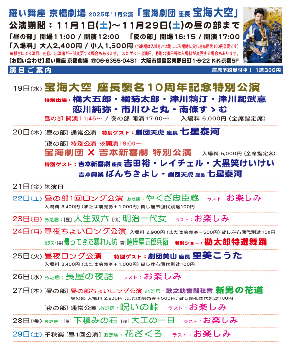 | 2025年11月 | 宝海劇団 座長 宝海大空 | 筑紫桃太郎一座 座長 筑紫桃之助 | 藤間劇団 座長 藤間歩 | 剣戟はる駒座 座長 津川鵣汀 座長 津川祀武憙 | 劇団KAZUMA 座長 藤美一馬 |