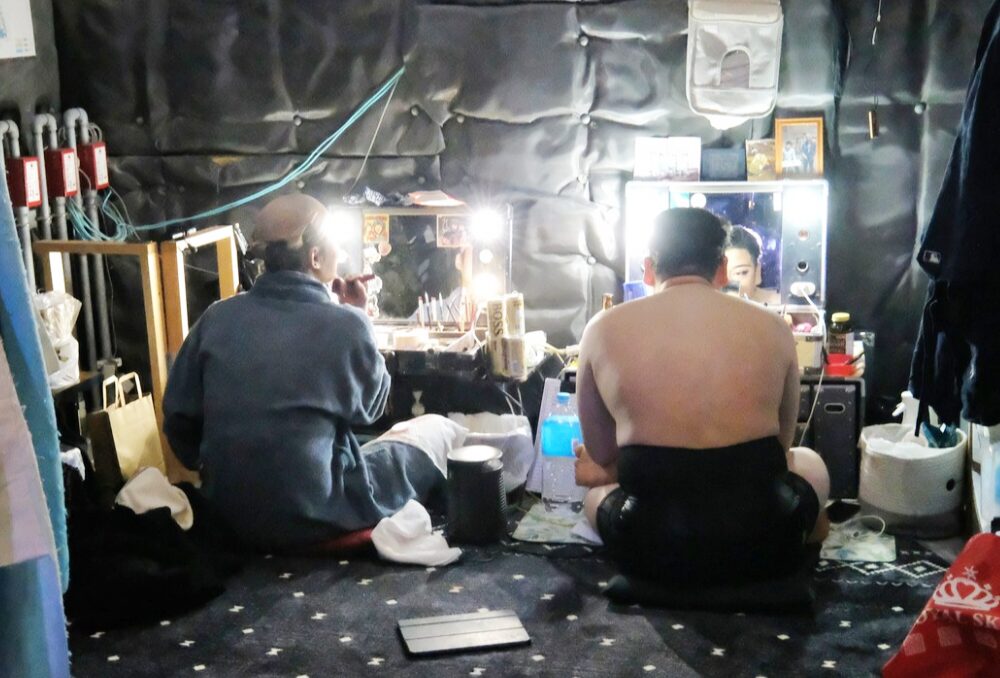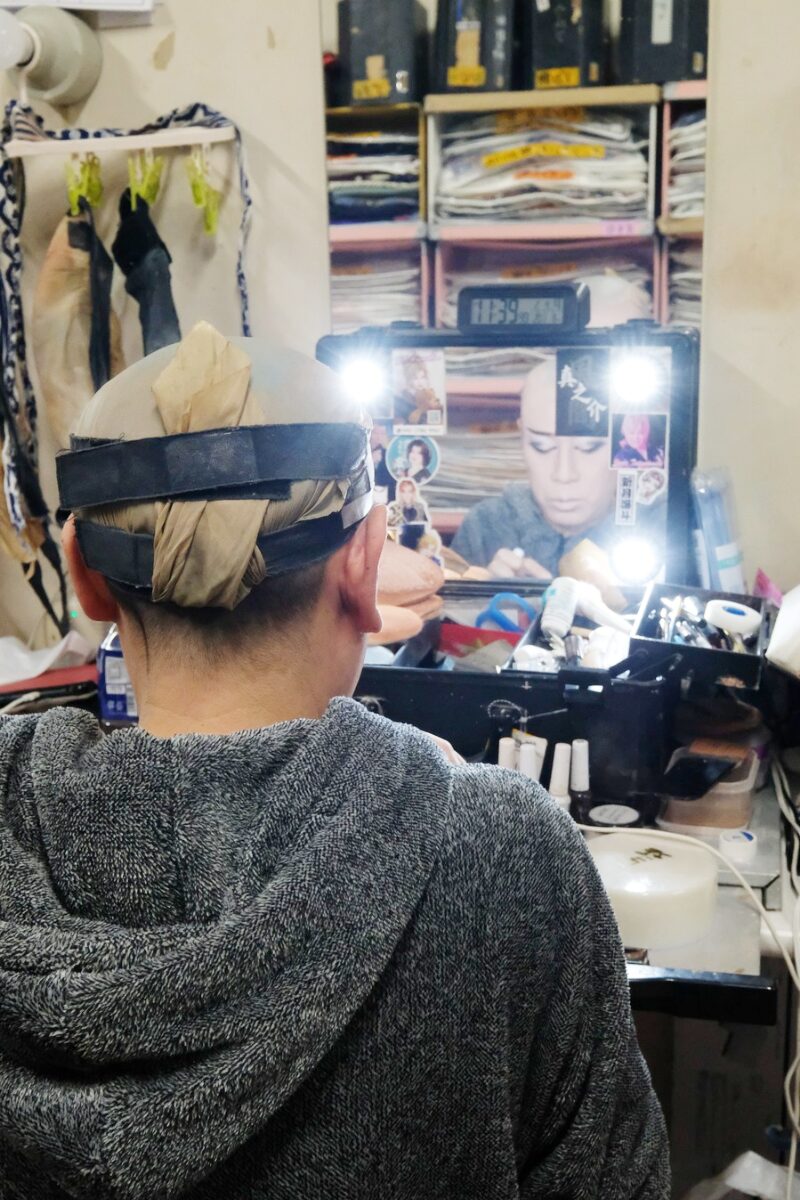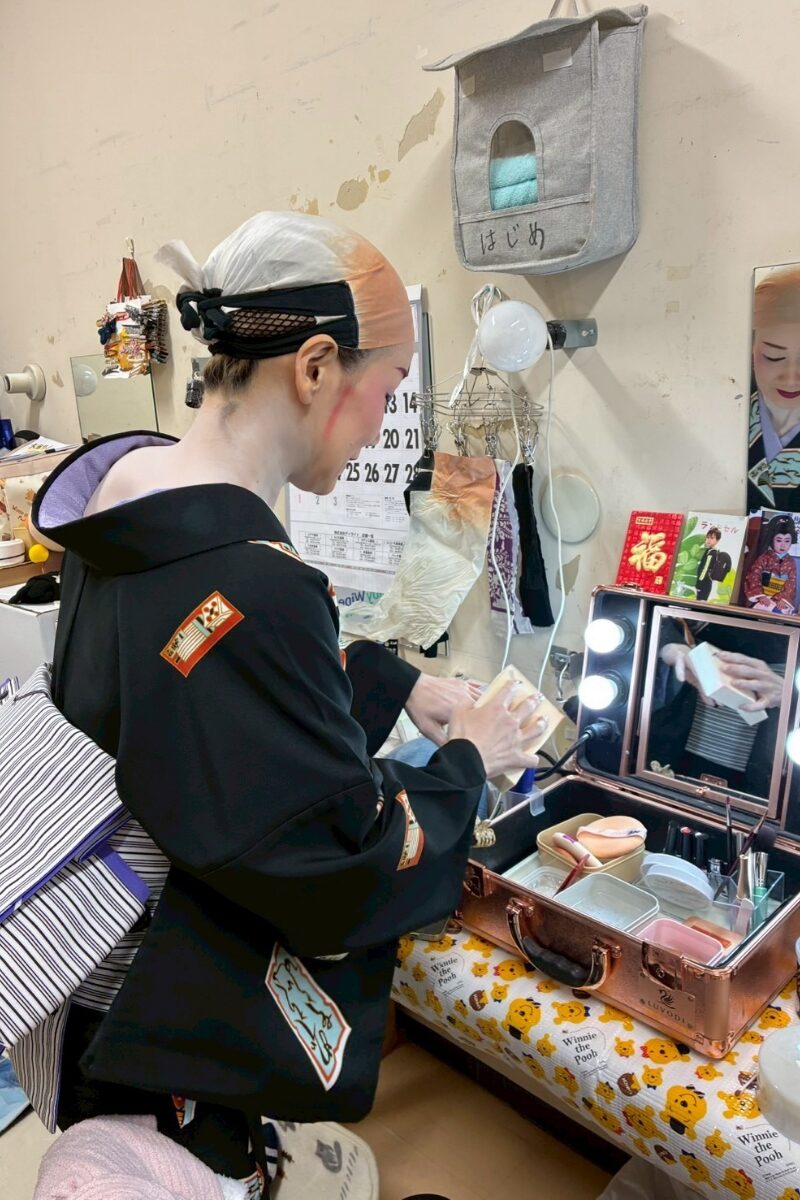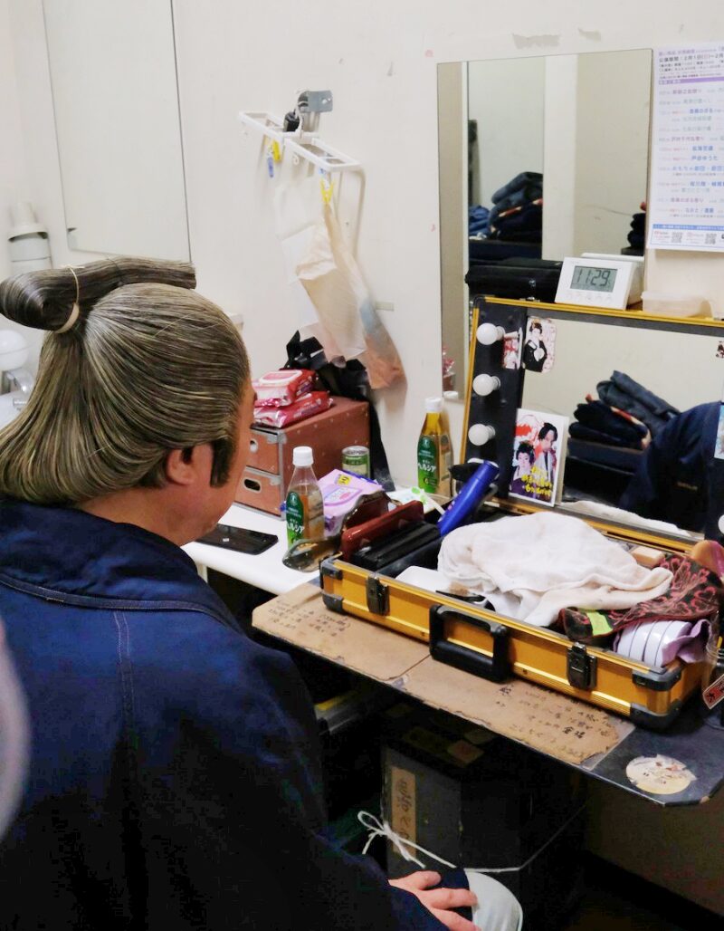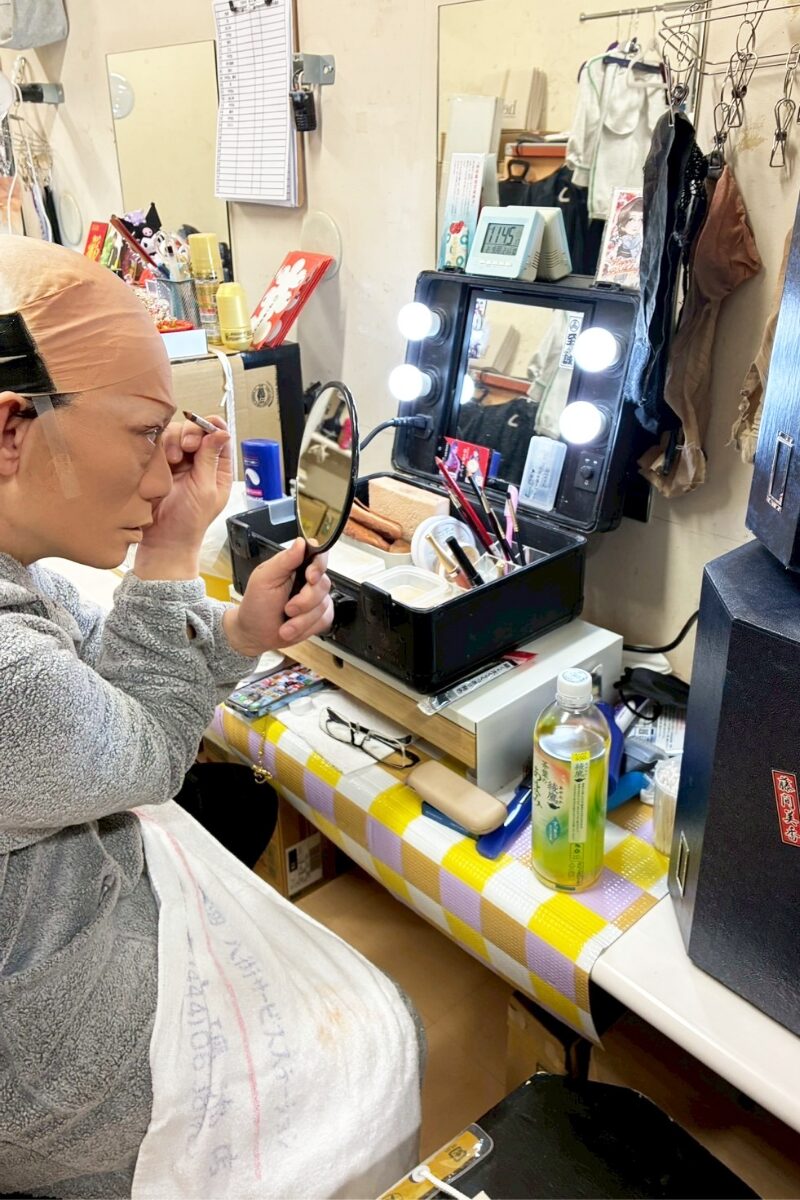 舞台袖に戻ると泰河座長と千代丸座長が仲良く通話しながらお化粧されていました。