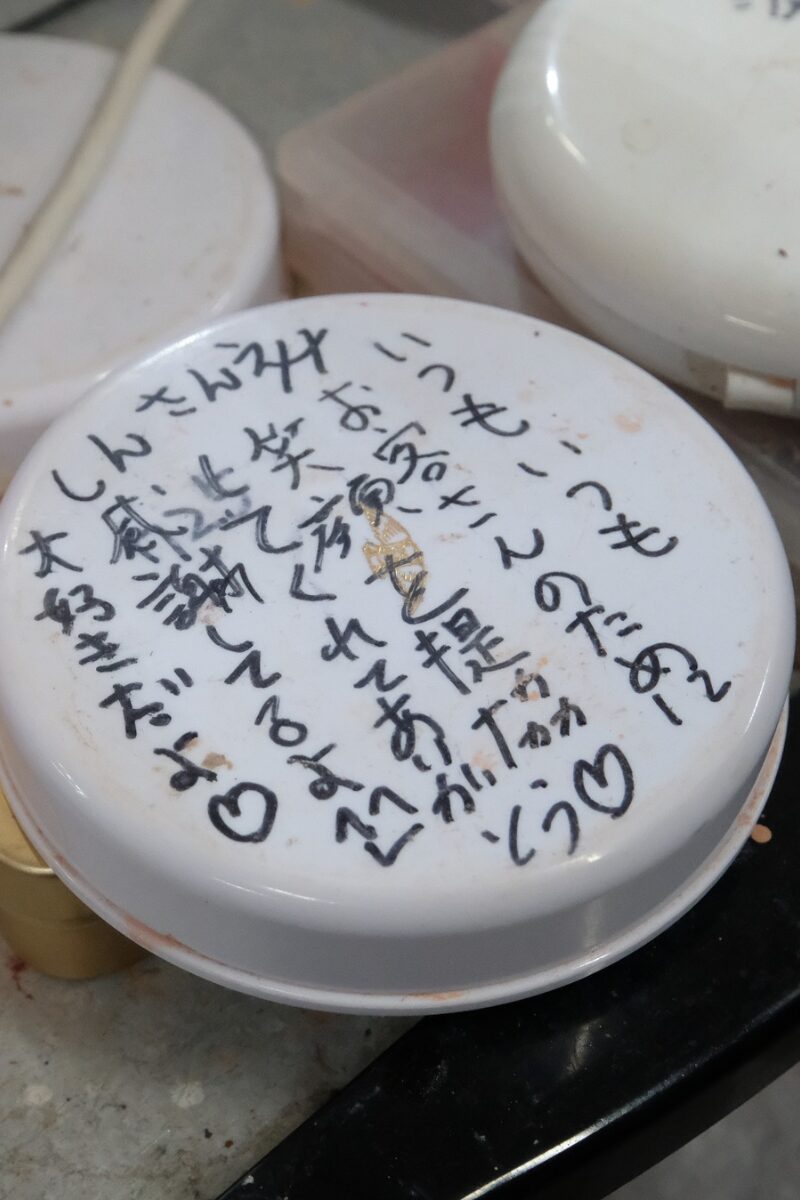 お化粧品のふたには他の劇団の方に書いてもらったというメッセージが書かれていました。