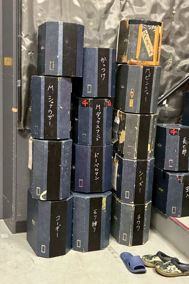犬種が書かれているカツラケースがたくさんあり、気になって聞いてみると千代丸さんの舞踊用のカツラだそうで「俺の101匹わんちゃんって言いたいだけ」だそう。