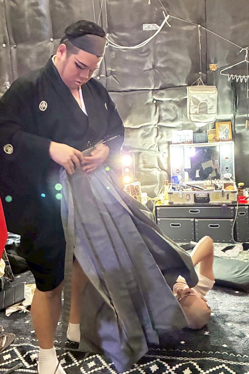 終演後、片づけをする泰河座長と寝転がっている千代丸座長。