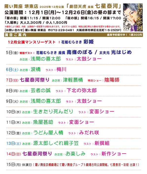 | 2025年12月 | 劇団華×七楽座 総座長 市川かずひろ 座長 市川たかひろ 座長 中村喜道 | 劇団神龍 座長 澤村神龍 | 劇団天虎 座長 七星泰河 | おもちゃ劇団 座長 市川おもちゃ | 宝海劇団 座長 宝海大空 |