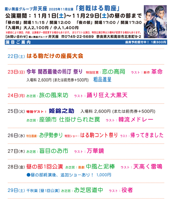 | 2025年11月 | 宝海劇団 座長 宝海大空 | 筑紫桃太郎一座 座長 筑紫桃之助 | 藤間劇団 座長 藤間歩 | 剣戟はる駒座 座長 津川鵣汀 座長 津川祀武憙 | 劇団KAZUMA 座長 藤美一馬 |