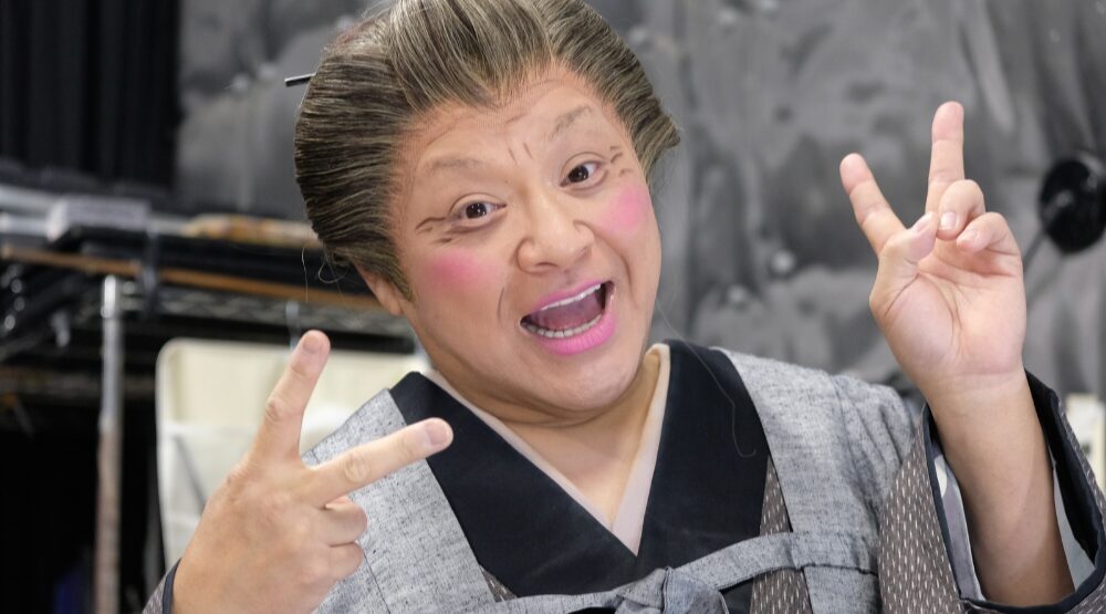 茶屋から出てきたのはかずひろ総座長演じる茶屋のおかみのひとみばあさん。