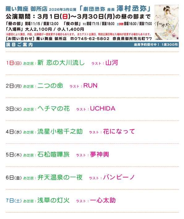 ※ゲスト出演日、特別公演日等は入場料が変更する場合もあります。