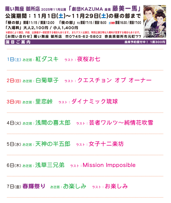 ※ゲスト出演日、特別公演日等は入場料が変更する場合もあります。