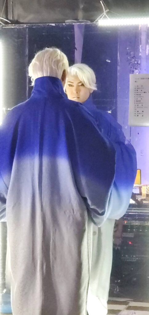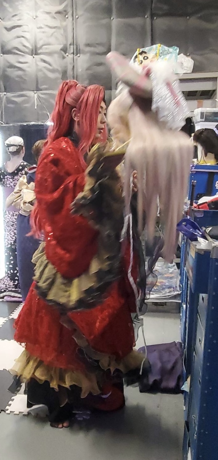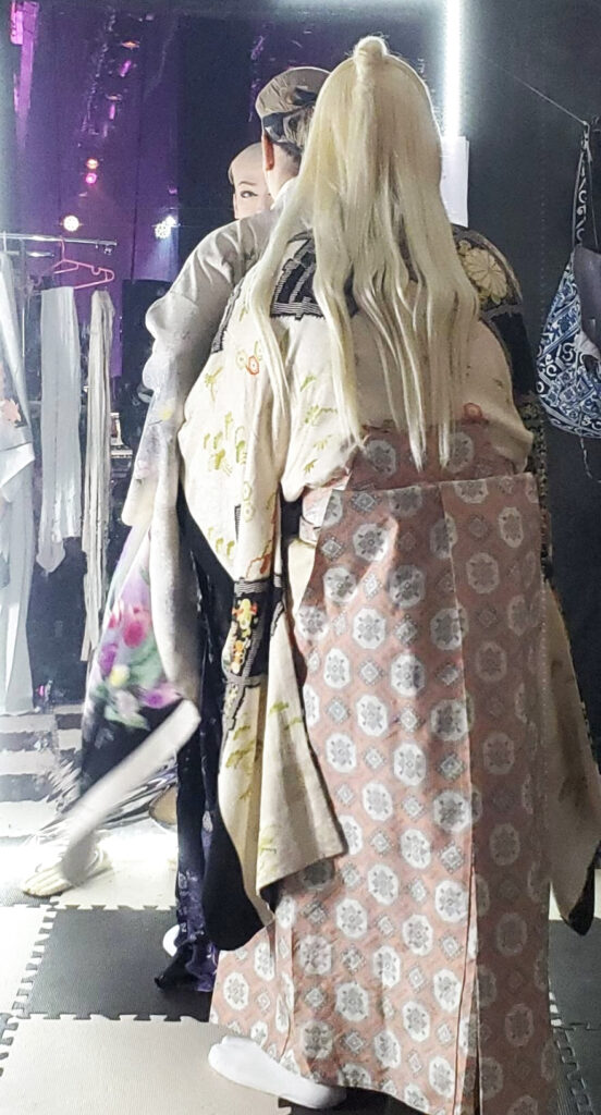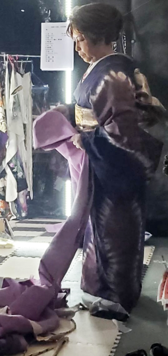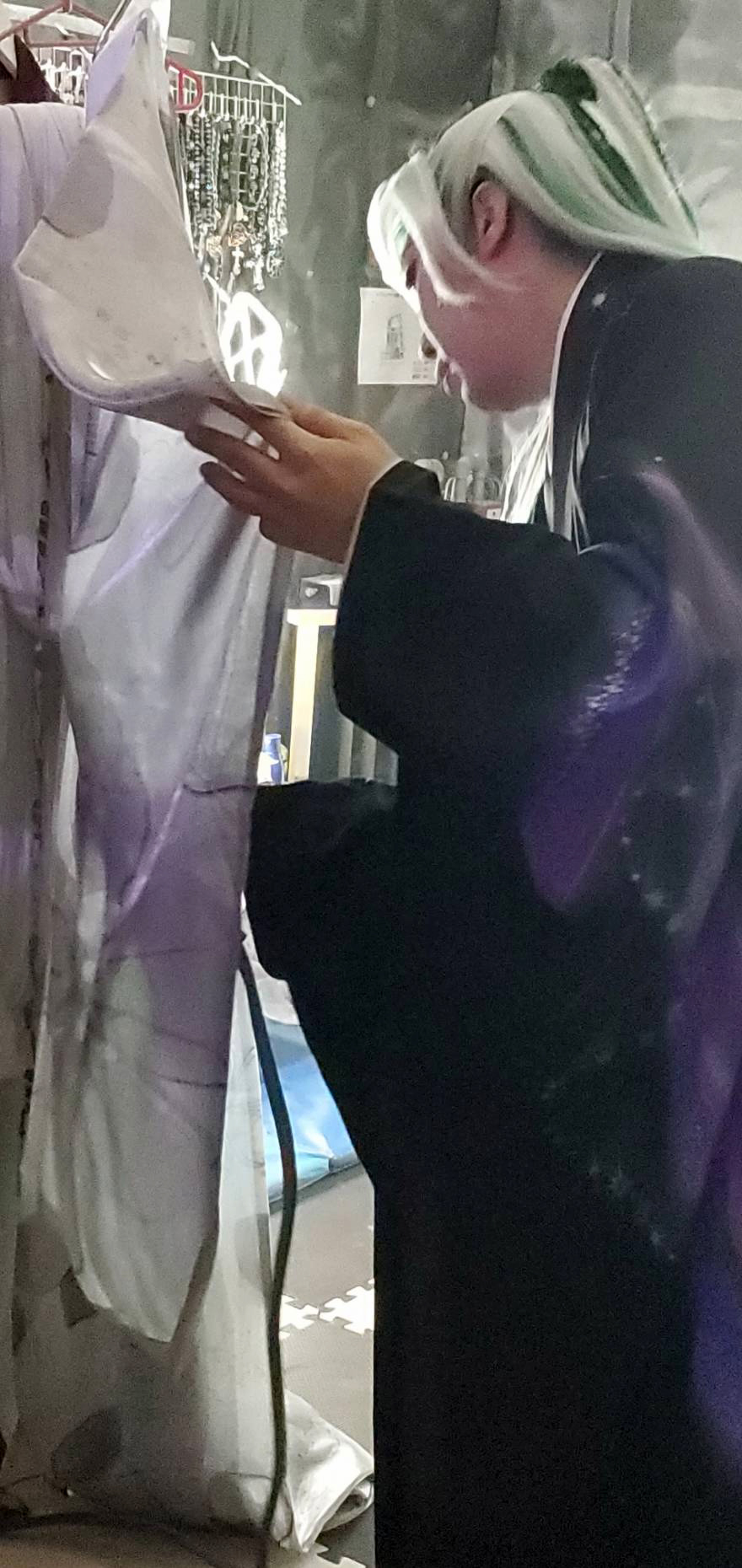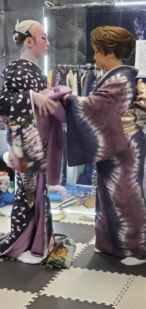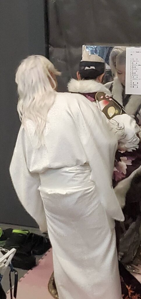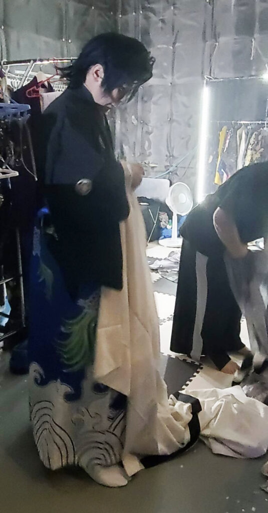 その前では、フリルがたくさん付いた着物姿の大心さんが鬘の準備をしていました。
