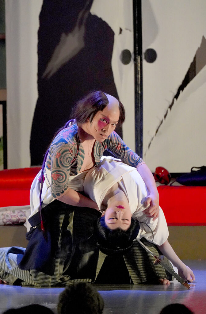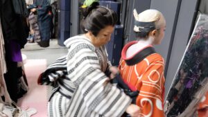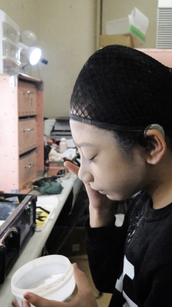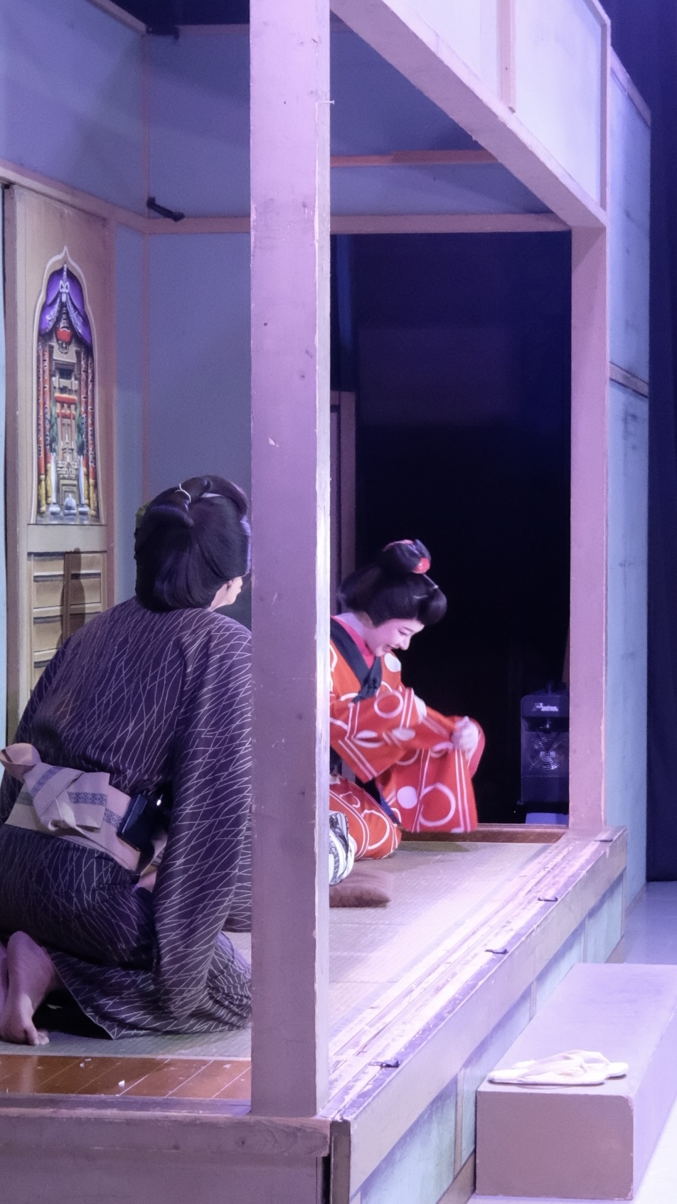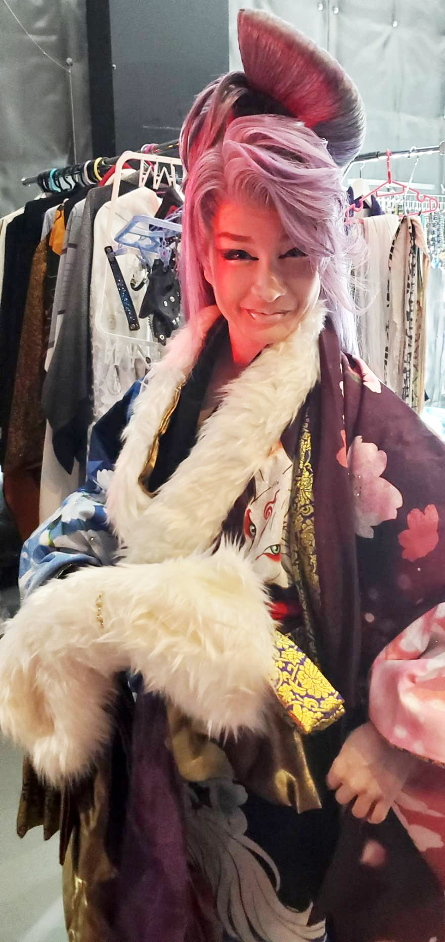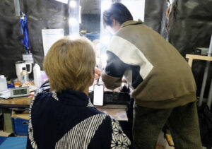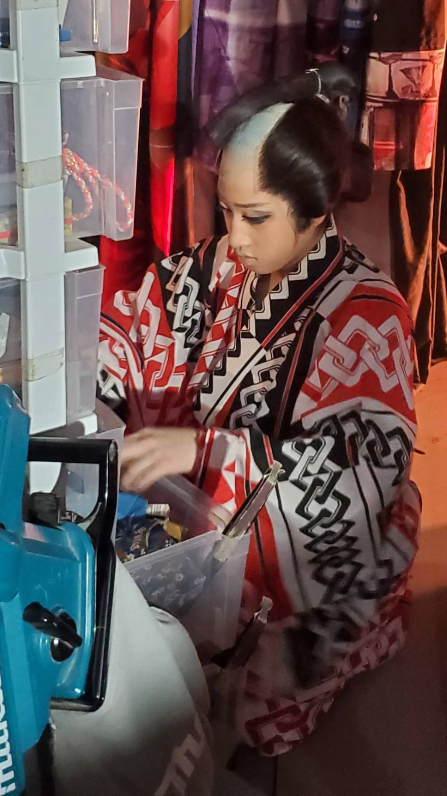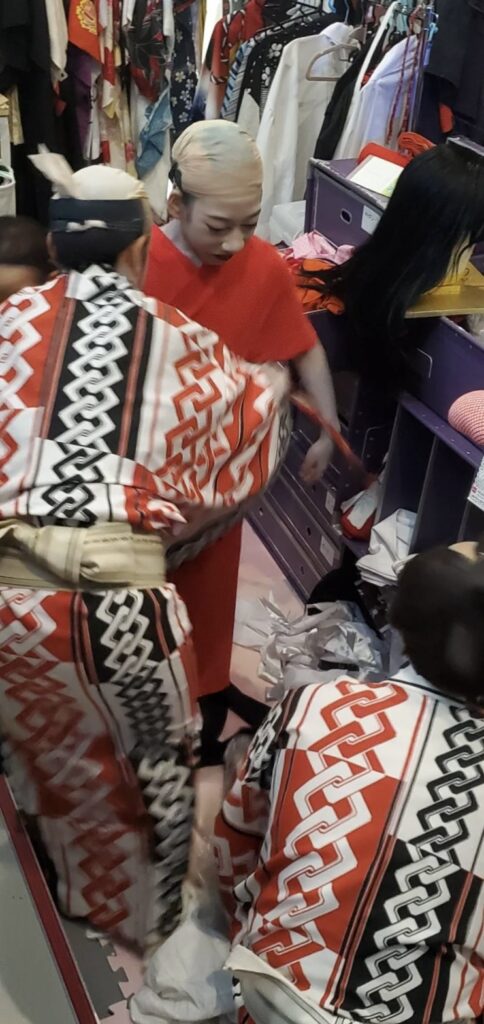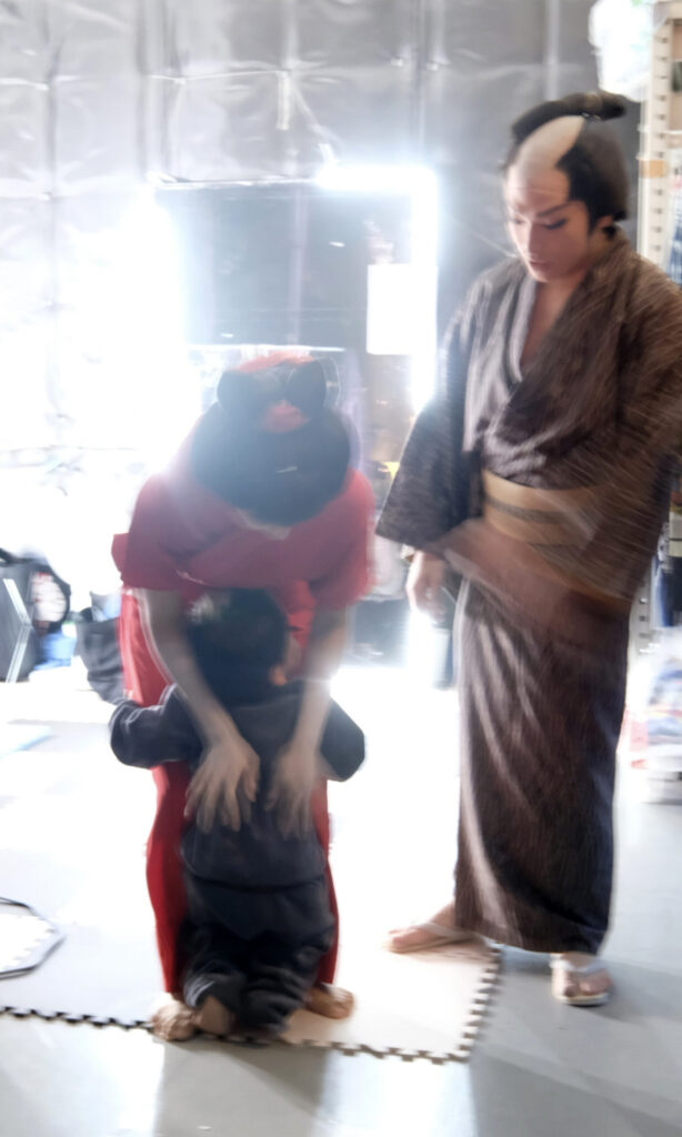 その前では、フリルがたくさん付いた着物姿の大心さんが鬘の準備をしていました。