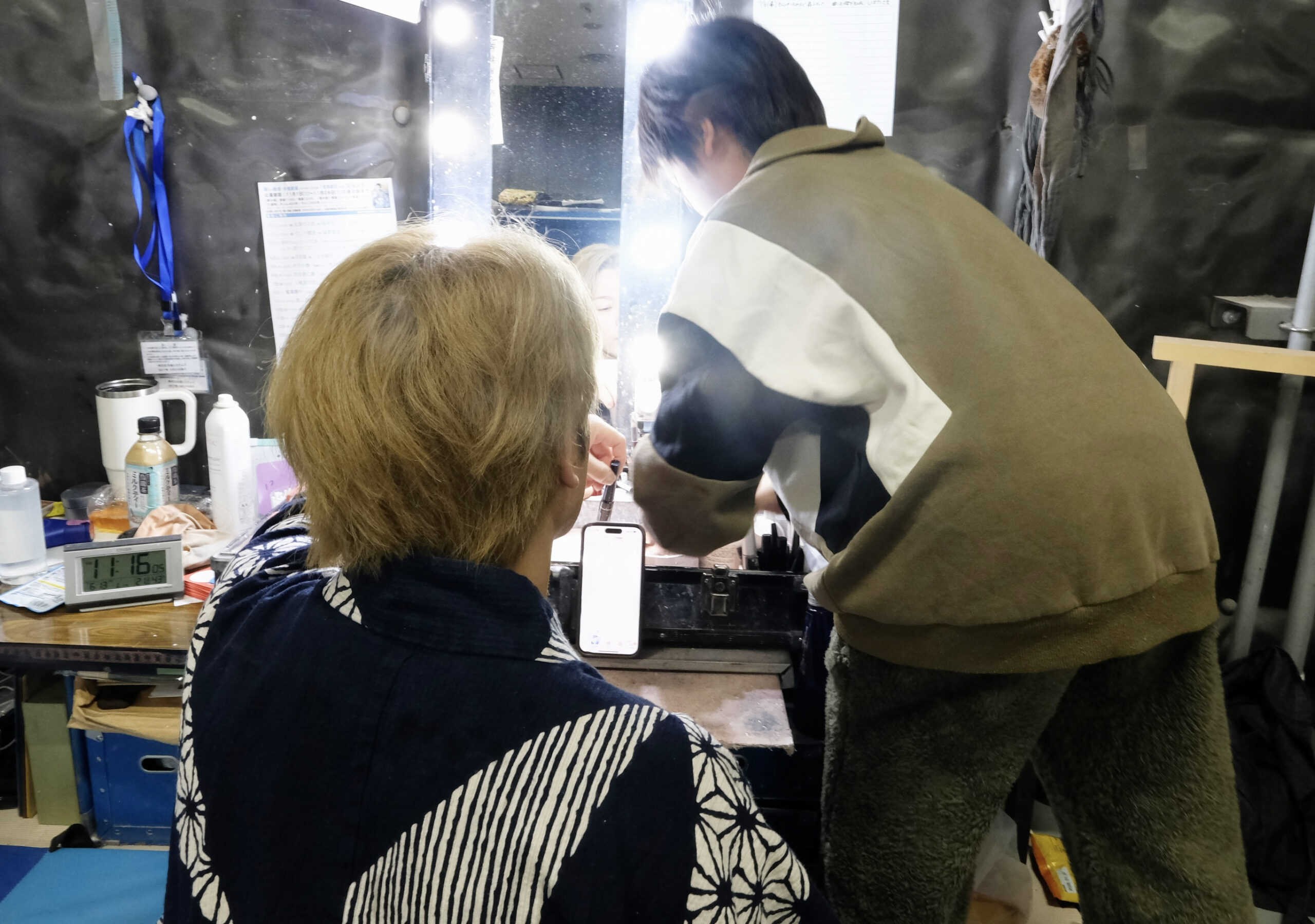 下の階の楽屋では座長以外の男性陣と女性陣がお化粧を始めていました。