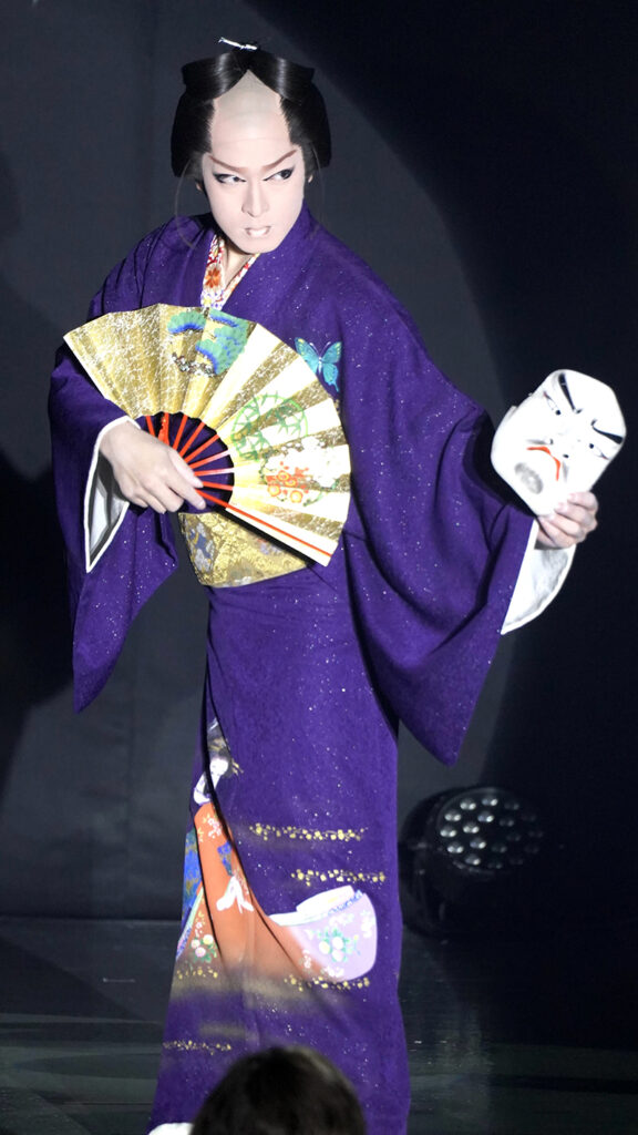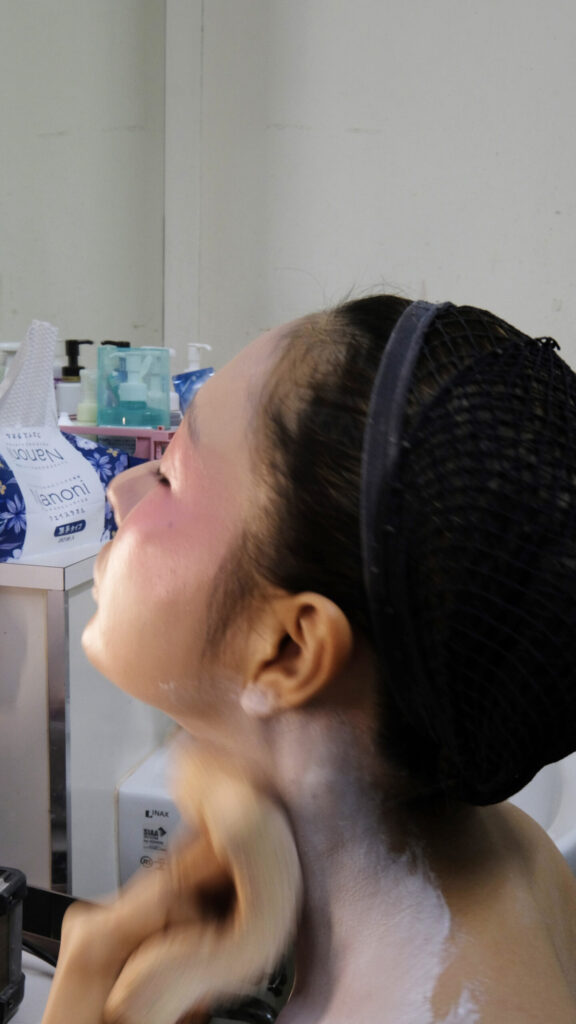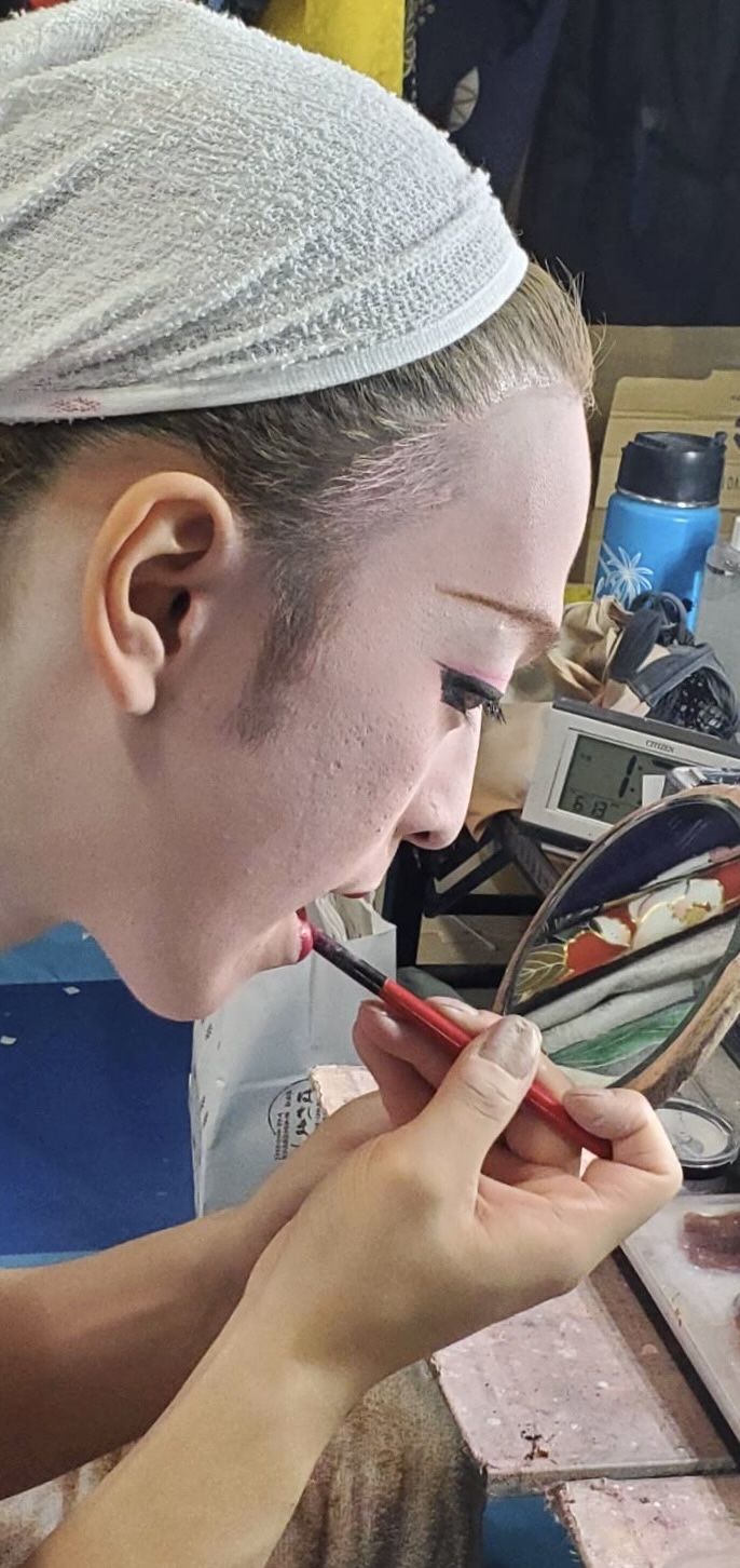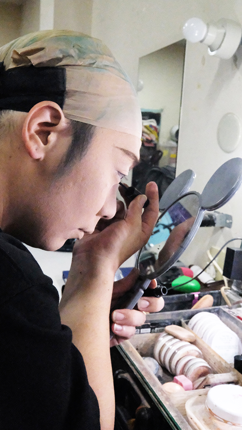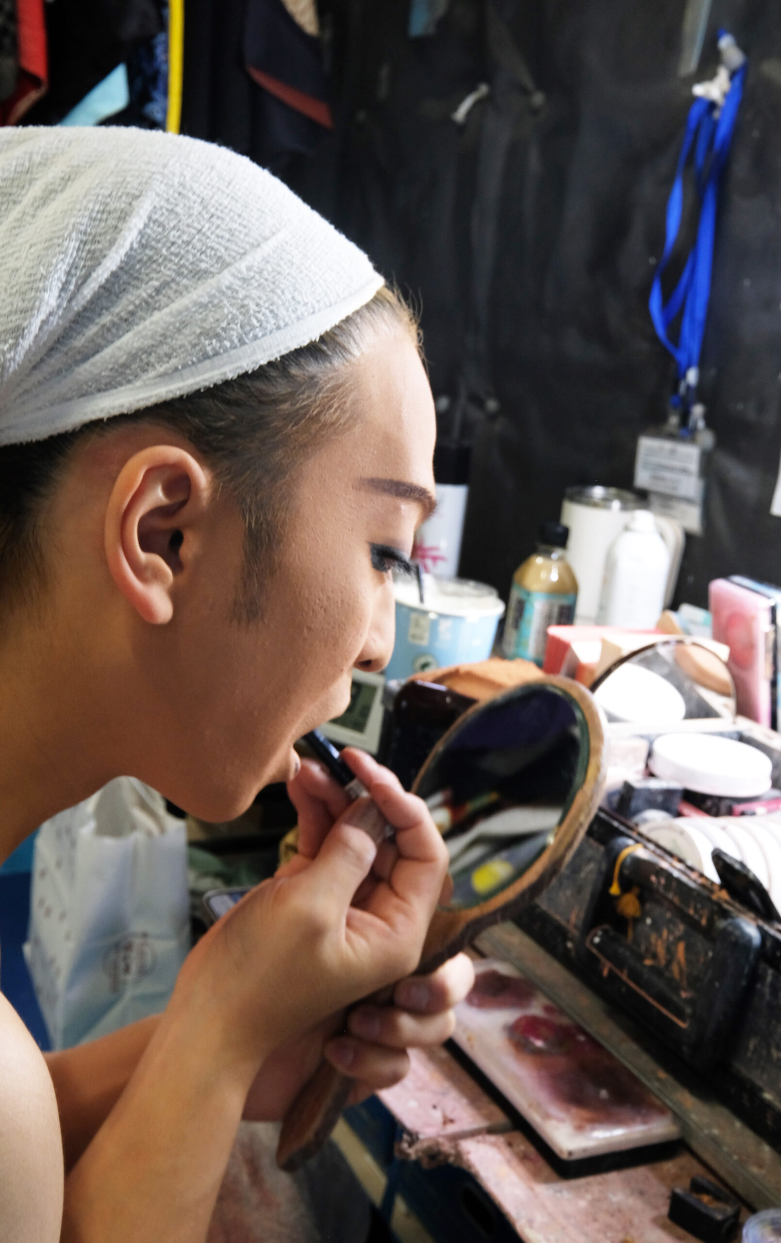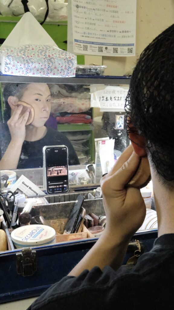 舞台袖近くでは一曲目を踊り終えた座長は次は立役のため、化粧替えをしていきます。