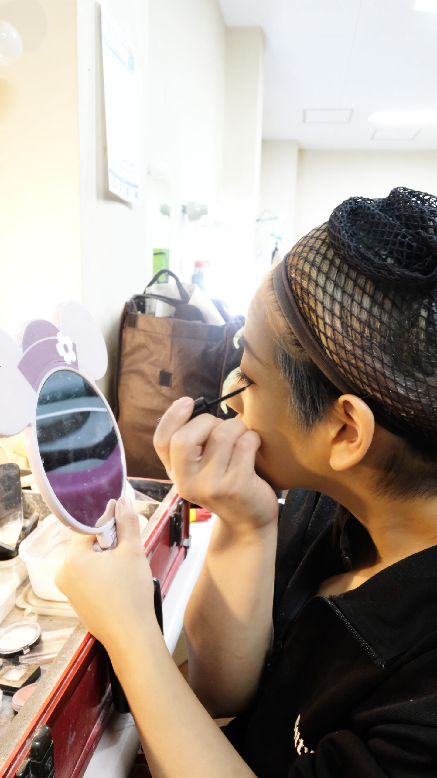 本日のお芝居の動画をスマホで流しながらお化粧中。
