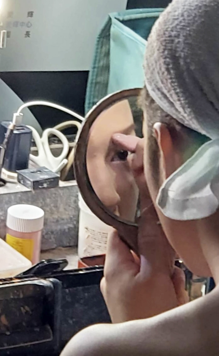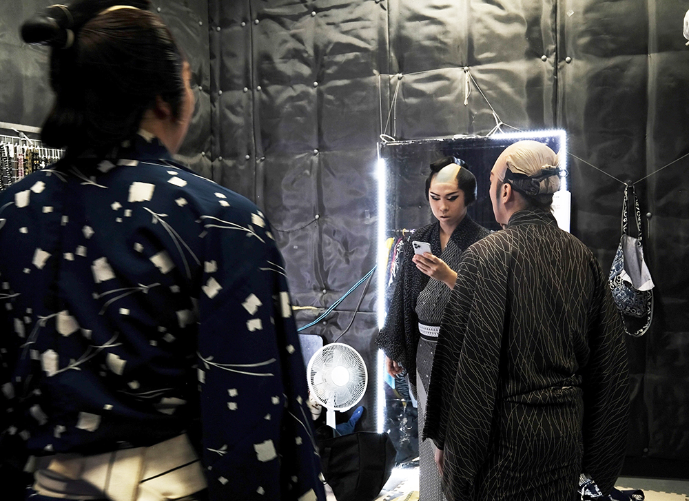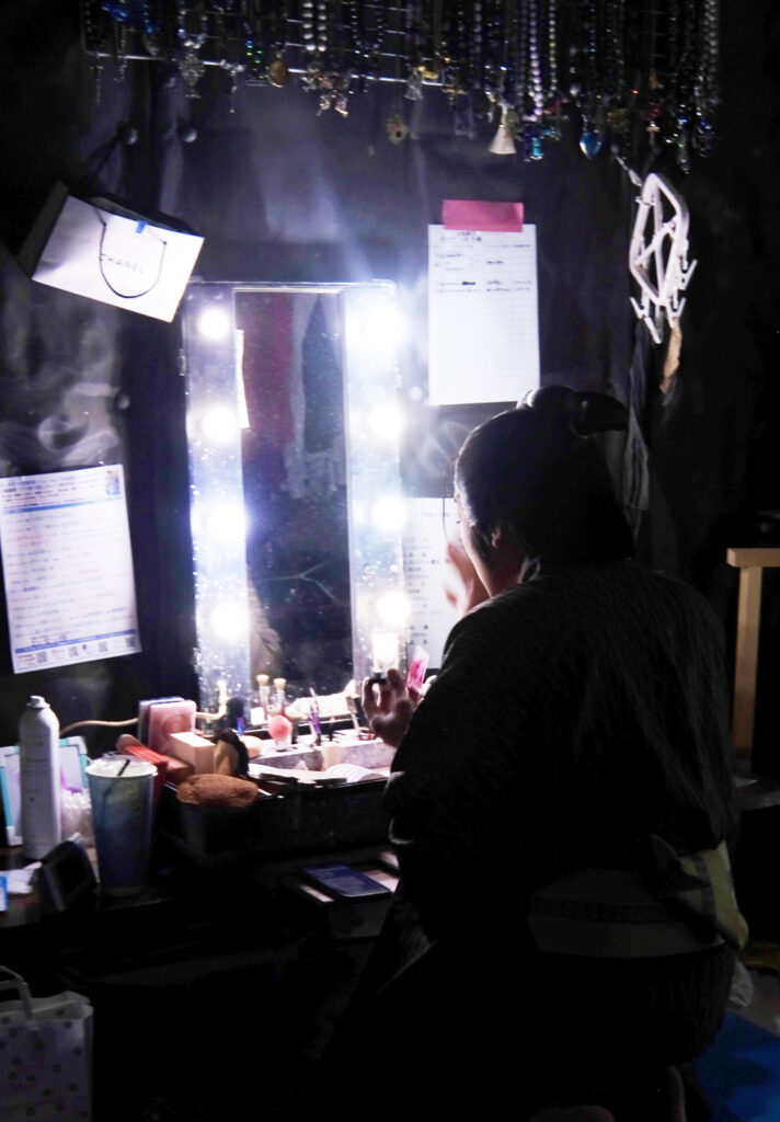 次の出番待ちの空也さん、鏡前で姿をチェック。