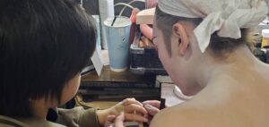 蘭丸さん、お化粧をし終えた勘太郎くん、未来さんが今日の舞踊ショーについて話し合い中。